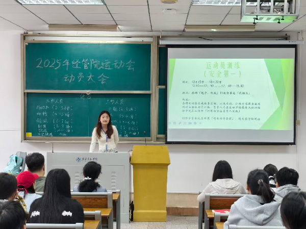 随后,学院学生会副主席刘雯同学面向全体运动员作动员宣讲。她详细解读比赛流程、纪律要求及安全注意事项,公布科学系统的备战训练计划,鼓励运动员们以科学训练为基、以全力以赴为志,在赛场上奋勇拼搏、超越自我,赛出经管风采、为学院争光添彩。