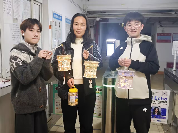 活动现场暖意融融,“巧手制花灯”环节率先点燃了大家的创作热情。工作人员提前备好了彩纸、双面胶、LED灯串等丰富材料,同学们围坐桌前,拿到材料后便迫不及待地动手创作。折叠、粘贴、拼接、装饰,指尖翻飞间,一个个造型别致的花灯逐渐成形:有的绘有山水诗词,有的点缀着蝴蝶装饰,还有的在灯下面暗藏着新学期的美好期许。当暖黄灯光透过镂空的灯面亮起时,每一盏花灯都成了承载创意与心意的艺术品。还有同学提着自己亲手制作的花灯送给宿管阿姨。