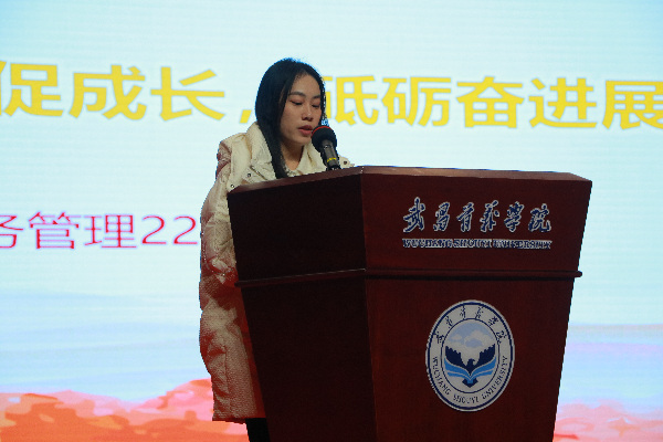 财务管理2202班付葛雨晴作为2022-2023学年优良学风班代表,从自身作为团支书的经验为引,分享了如何进行班级建设,如何作为团支书带动班级协同发展。她认为“一个好的集体离不开每一个人的耕耘”,建立优秀班级需要所有人的共同努力,团结一心朝着同一个目标前进。会计2101班柳学慧是“文明宿舍”的先进代表,她以“奋进四重奏,点滴‘宿’我们”为题分享了宿舍四人学习生活的点滴。正如她所言,思想觉悟高、履行责任实、学风建设好、学科竞赛强、活动质量高是她们114宿舍的代名词。在大学三年的学习生活中,她和室友们一起努力奋进,一起备战四六级,也一同获得了诸多荣誉。她表示在接下来的学习生活中,114宿舍的每位同学都会以饱满的精神状态投入到专业学习当中,让彼此成为更优秀的自己。金融2101班周文文分享了自己志愿服务经历。在22年前疫情严重的时期,她加入到家乡的防疫青年大队中,这次经历让她明确了加入志愿服务队的心。大学三年她参加了不少志愿者活动,每一次的活动都让她对志愿者有了不同的理解,她在奉献中成长,在成长中锻炼。“我们的光芒或许不如星月般耀眼,但当我们汇聚在一起,足以比拟阳光!”周文文说道。这些活动不仅锻炼了她自身的能力,更用实际行动践行了社会责任感,增强了青年一代的使命感,让她领略了一个全新的世界。国家奖学金获得者、机电学院机电一体化技术专2102班彭建分享了自己的学习成长感悟。虽然从小患先天性耳聋,但在他的成长过程中,不健康的身体没有成为他成长路上的绊脚石,而是磨砺了他不同于常人的坚定意志。他将“理实结合”作为自己的学习和生活态度,苦难、困苦促使他更加奋进,在大学期间成功获得了多项国家级、省级奖项。同时,他也有一颗感恩的心,积极参加志愿活动,为社会贡献自己的力量,将收到的爱与鼓励回馈给社会。财管专升本2306班郭倩将励志的个人经历分享给学弟学妹们。家庭条件虽然困苦但她从未抱怨不公,在求学期间,她迎难而上、勤奋好学。家庭的困难并没有压倒她,反而磨练了她坚定的意志力,让她以186分的高分顺利通过专升本考试,还多次获得“国家励志奖学金”。她说:“青春有梦,但我们也要付诸行动,只有开始爬才能到达梦想的山顶。”市场营销2101班许陈欣以“在挑战中成长,在坚持中续航”为主题,讲述了自己的学科竞赛经验和成长经历感悟。大学期间,她积极参加各项大型活动和学科竞赛,荣获湖北省大学生红旗营销挑战赛创意视频奖、市场调研大赛校赛二等奖、学术活动先进个人等。除此之外,她注重身心健康协同发展,在今年她成功跑完了马拉松比赛。大数据与财务管理2202班蔡煜天在讲话中教会了我们如何平衡生活与工作,并且强调了选择的重要性,不要焦虑与迷茫,坚定目标向前走。报告会中,优秀学生们分享了自身的经验和心得收获,不仅教会了同学们在今后学习生活中如何处理问题,也激励在座的各位同学们,努力奋进,凝聚榜样力量,逐梦谱写青春华章。